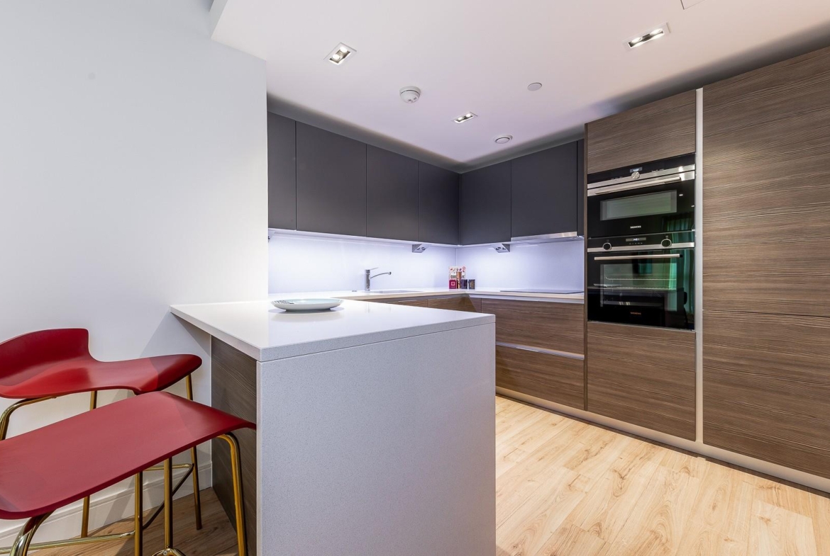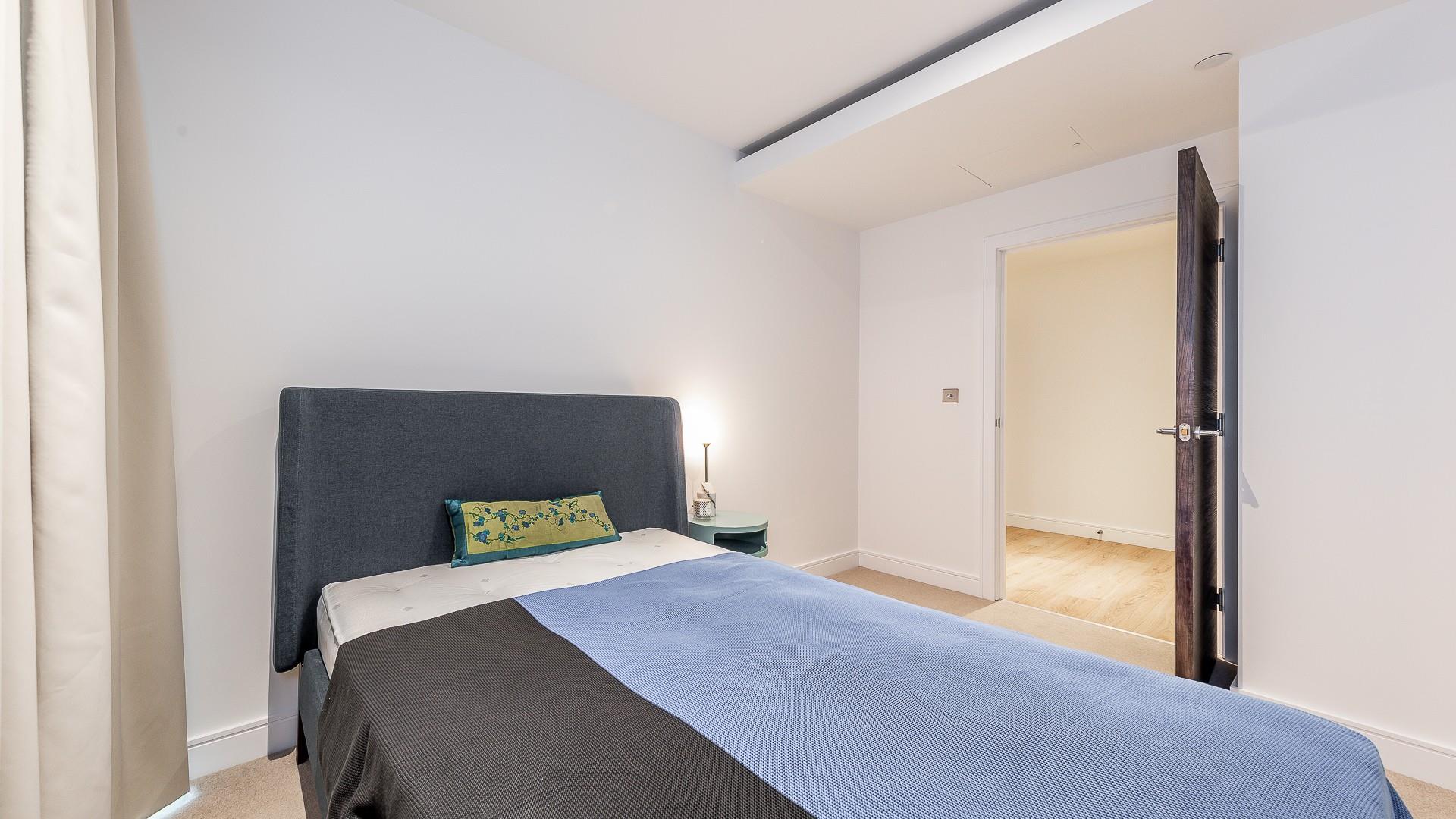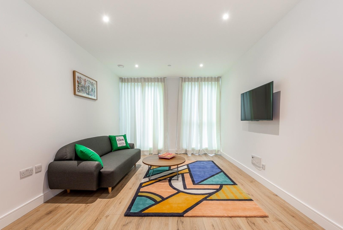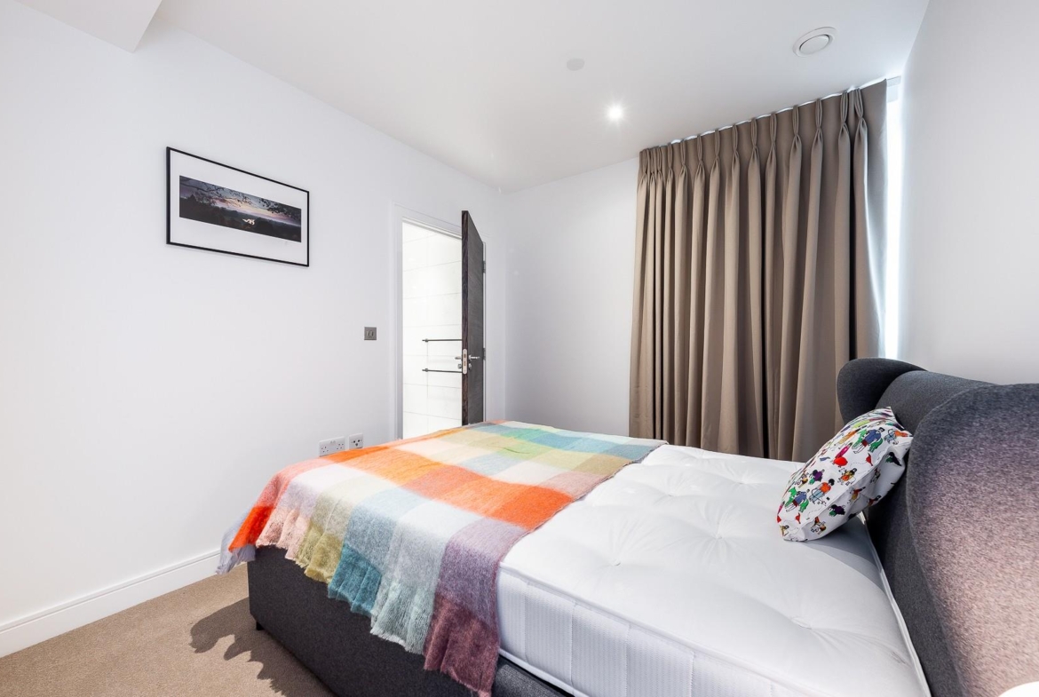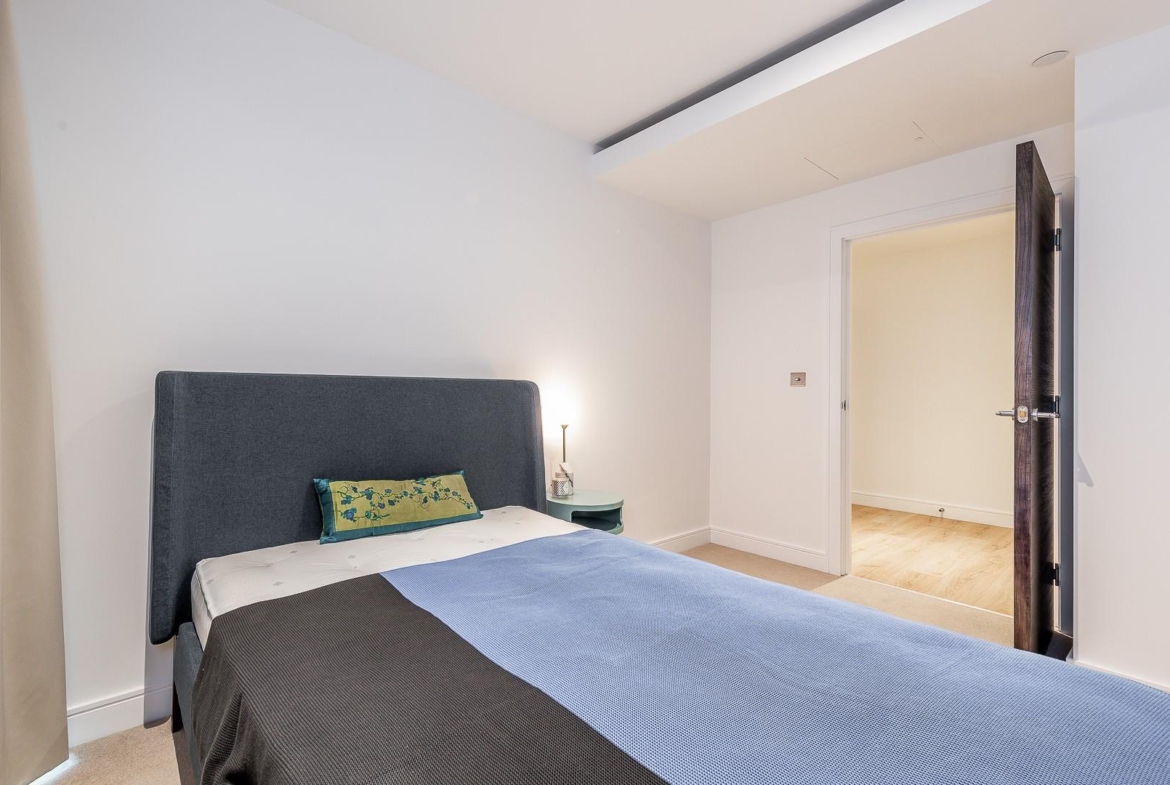 A modern 807 sq ft (74.4 sq m) apartment situated on the 6th floor of Sovereign Court, benefiting from a private balcony and floor-to-ceiling windows.