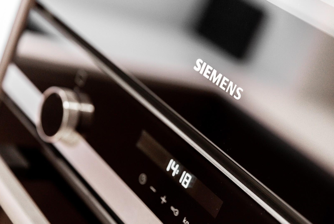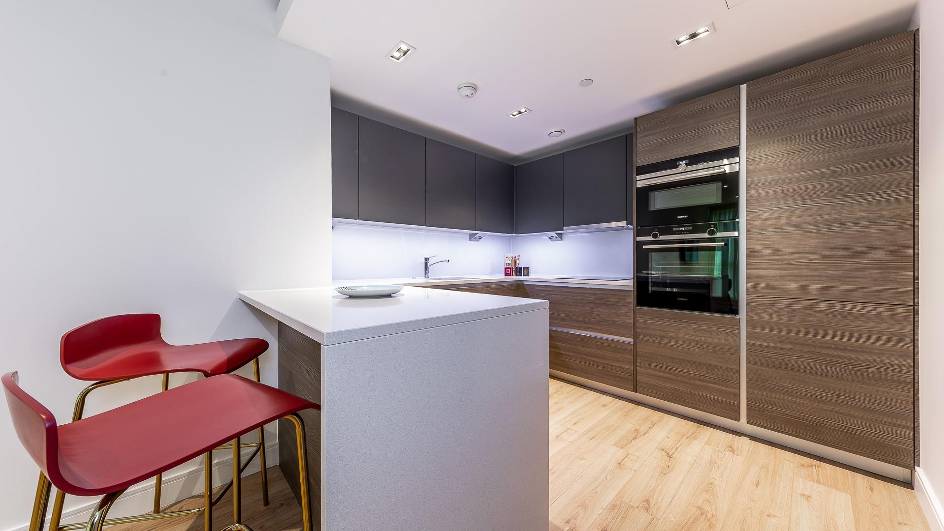 The accommodation comprises a spacious open-plan reception room with floor-to-ceiling windows providing excellent natural light, a designated dining area, and a fully fitted modern kitchen with marble-finish worktops and integrated Siemens appliances. The principal bedroom features built-in storage and a stylish en-suite walk-in shower room, complemented by a second double bedroom and a well-proportioned family bathroom.