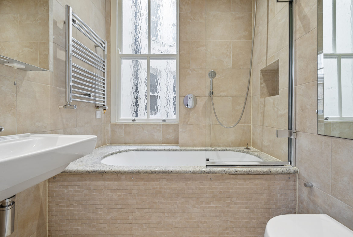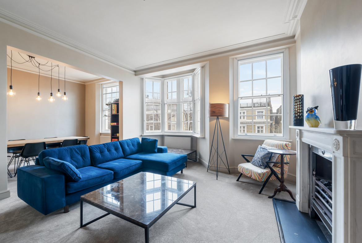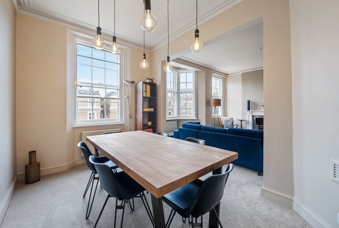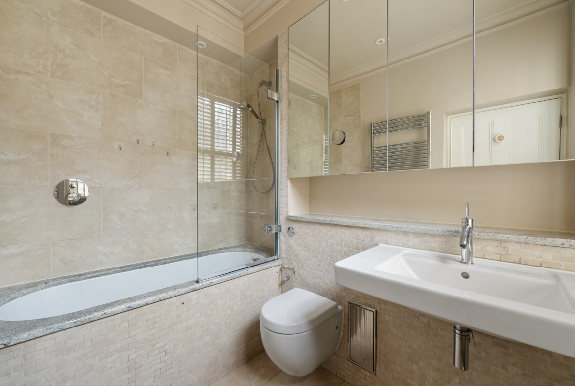 The flat measuring 1490 sqft (138.4 sqm) has a kitchen, a drawing room, spacious dining room, two ensuite bedrooms and one bedroom overlooking Redcliff Gardens with the balcony, and a guest toilet. The kitchen is modernised with built-in furniture and latest appliances. High ceilings (2.9m) and sash windows fill the apartment with air and lots of light.