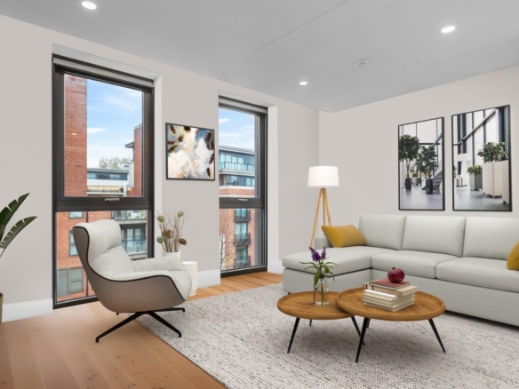 Residents enjoy the convenience of underground parking and a 24/7 concierge and have access to health and well-being facilities, including a gym and a swimming pool.