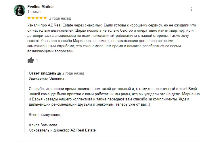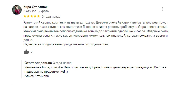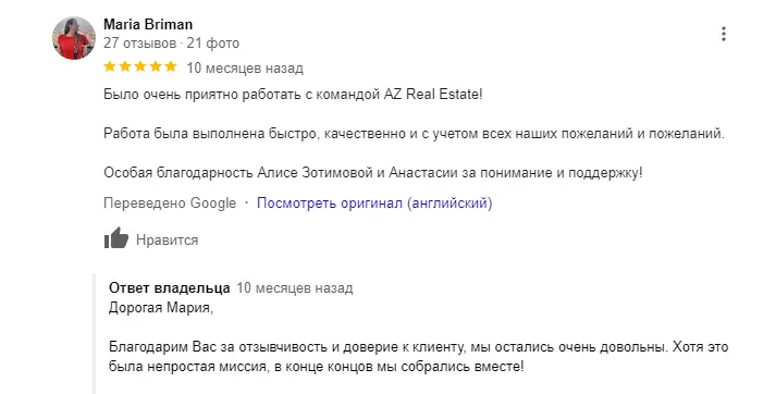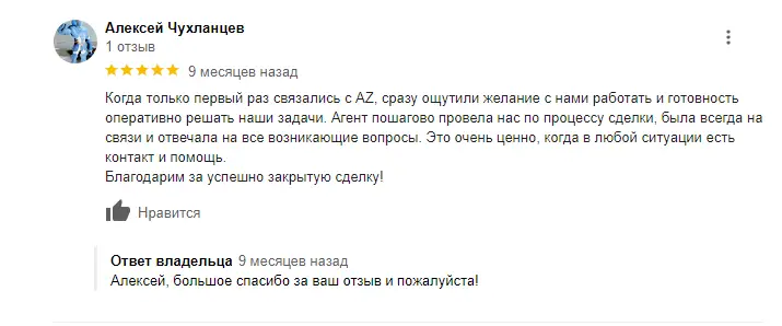 Мы быстро и качественно отвечаем на каждое обращение покупателя по телефону, WhatsApp, электронной почте или в социальных сетях, где публикуем все новые объекты. Мы оперативно выясняем впечатление от просмотра у покупателя и сразу же предлагаем сделать оффер в случае положительного ответа.