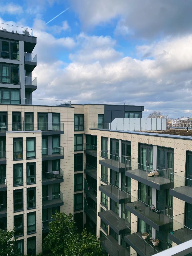 A modern 807 sq ft (74.4 sq m) apartment situated on the 6th floor of Sovereign Court, benefiting from a private balcony and floor-to-ceiling windows.